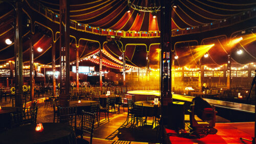 Spiegeltent translates as ‘mirror tent’ and they were created in the Flemish Region of Belgium in the late 19th century. Spiegeltents are hand-hewn pavilions known for their wild and decadent ambiance and used for travelling dance halls, bars and bohemian entertainment salons. The magnificent round tent is made of dark wood with intricately carved panels, stained glass windows, bevelled mirrors and an impressive draped ceiling. Its innate beauty and romance makes it a truly extraordinary venue for any event. Our Spiegeltent continues this fine tradition with an exquisitely decorated performance space that is ideally suited to Christmas parties, masquerade balls, live music shindigs and food filled festive soirees.